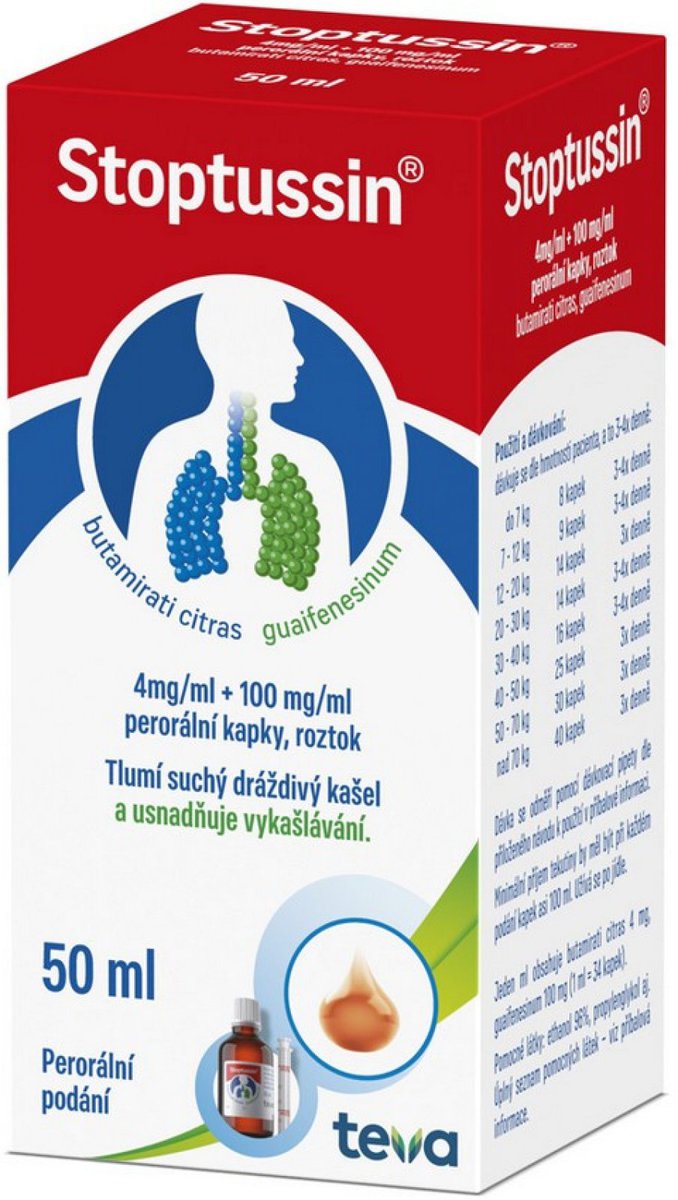 Přípravek tlumí dráždění ke kašli a mění skladbu průduškového hlenu a usnadňuje tak jeho vykašlávání. Přípravek se používá k léčbě suchého, dráždivého a obtížně ztišitelného kašle při virových infekcích horních a dolních dýchacích cest, při zánětu hrtanu, průdušek a plic. Na doporučení lékaře lze přípravek Stoptussin podat i k utišení kašle před a po operaci, u astmatu, tuberkulózy a zaprášení plic.