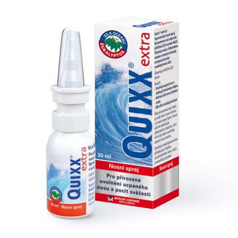Quixx extra je hypertonický nosní sprej, který obsahuje pouze přírodní složky. Neobsahuje žádná konzervační činidla a nevyvolává závislost. Pomáhá při rýmě, nachlazení a alergii, uvolňuje ucpaný nos a zvlhčuje nosní sliznici.